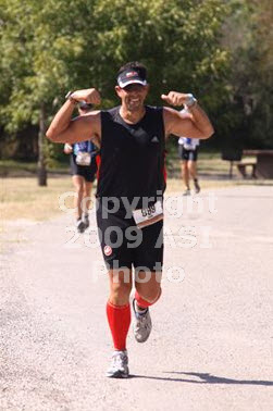 So 2 Hours and 47 Minutes later I was at T2 getting my “Run bag” set up and making sure I had everything I needed for the next 13.1 miles! Got my visor, ipod (just kidding), number belt, running shoes & changed to a sleeveless running jersey. I start my gallop to the Run Start and I almost go right pass the two ladies with their palms greased! I stop and ask, “Sunscreen?” Indeed, they say, and so with a shoulder twist, I say “Yes, please!” and soon I look like a Canadian tourist on vacation at your local beach! My red Zensah’s White sunscreen lathered all over my face and shoulders and my hair puffing out from my visor! Let’s Get it On! Well, my run legs are not quite with me yet, so the first 3 miles are less then fun, as we hit two hills, one steady grade and another steep and unforgiving. But just when I think that the best is yet to come, we enter the park and hit the trails. Holy Poly Guacamole!