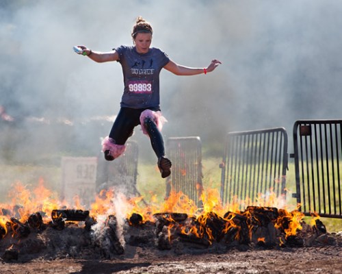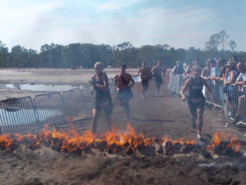 For the final stretch its a quaint dual fire leap followed by the infamous mud pit and barbed wire persuasion bathers!