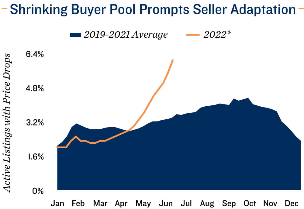 Owners adapt as affordability collapses buyer pool. Fewer existing homes sold in May than in any month since the second quarter of 2020. This moderation coincided with a six-month high in the number of home listings, a signal that purchases are now being reduced by forces other than a low for-sale inventory. During much of the past two years, the lack of homes on the market was the predominant buying constraint, but affordability is beginning to have a heavier influence. Single-family brokerages noted declines in tour requests and other engagements in recent weeks, prompting sellers to be slightly less aggressive with pricing as the market begins to settle. Still, the median price of an existing home rose for a 24th consecutive month to $403,300 in May.